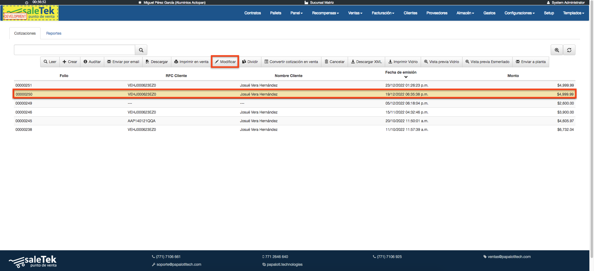 - Se mostraran los botones con las diferentes opción para realizar con la cotización, deberás dar clic en el botón que dice «Modificar».