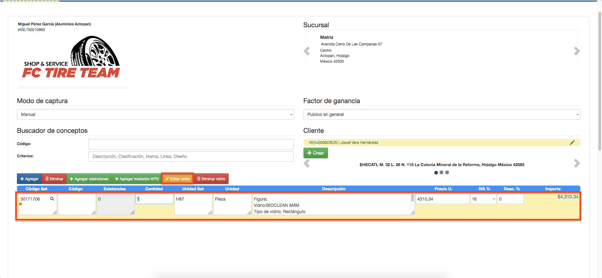 - Dar clic sobre la partida que se desea modificar y después dar clic en el botón de «Editar vidrio».